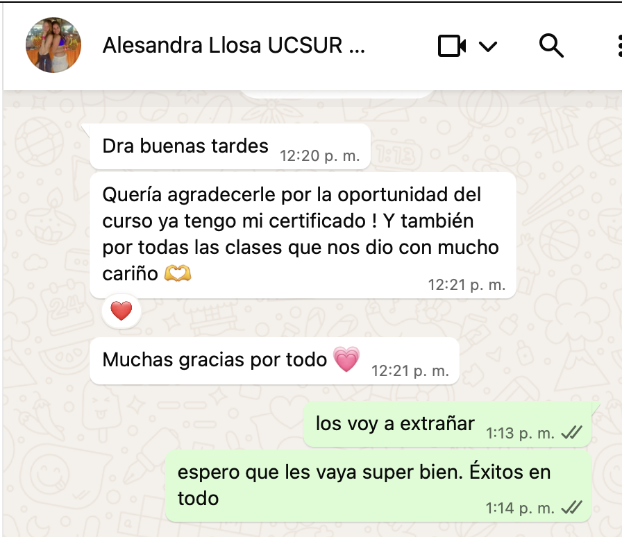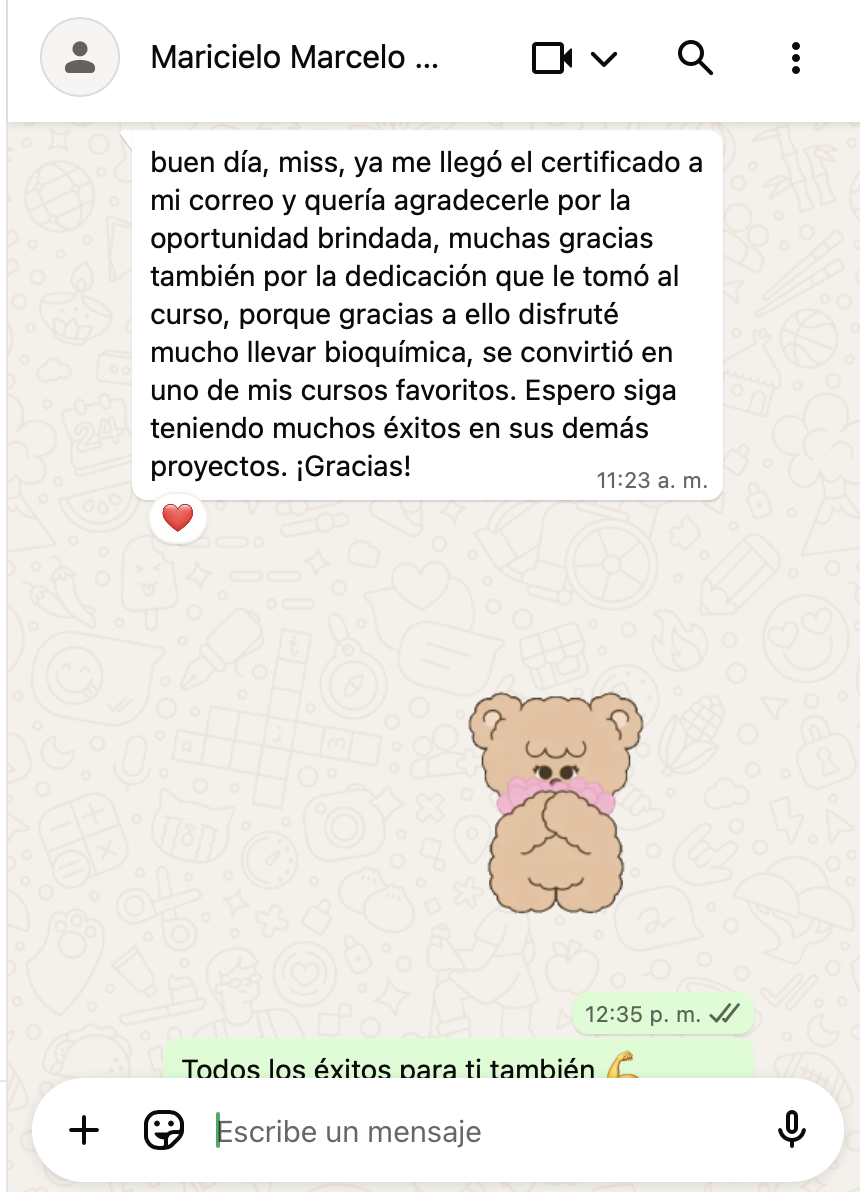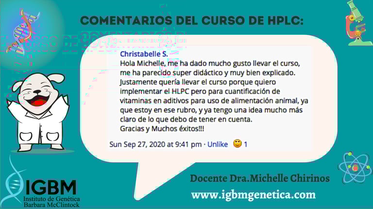 La fundadora del IGBM es docente del curso de bioquímica en la Universidad Científica del Sur y entrega becas a los estudiantes más destacados de sus cursos, aquí alguno de los comentarios.