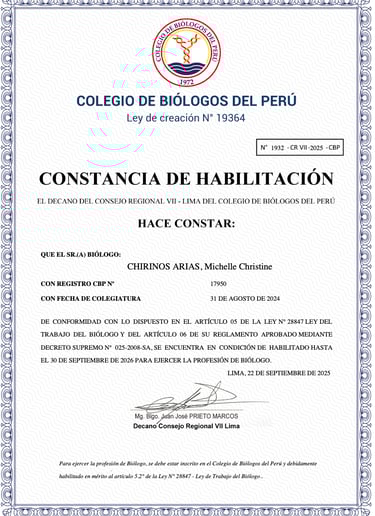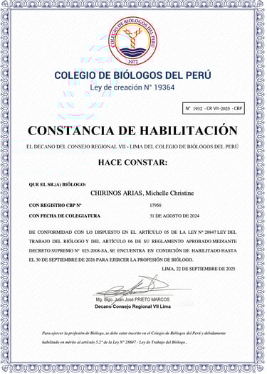 La Dra. Michelle Chirinos Arias, quien firma los certificados, es una profesional colegiada con Nº CBP 17950 (verificar aquí) y habilitada (accede aquí), según el artículo 5.2 de la Ley Nº 28847 y el artículo 3 del Decreto Ley N° 19364, para ejercer la profesión de biólogo se debe estar debidamente colegiado, por tanto verifica que tus certificados te los emita un profesional colegiado. La Dra. Chirinos ha sido calificada como investigadora REGINA en el 2016 (ver reconocimiento), investigadora RENACYT en el 2018 (ver calificación) y en el 2025 (ver calificación) por el CONCYTEC (Consejo Nacional de Ciencia, Tecnología e Innovación Tecnológica). Siendo investigadora CONCYTEC registrada con el código P0011641. La calificación de investigador CONCYTEC se otorga con base al número y calidad de las publicaciones científicas, los grados académicos y las propiedades intelectuales de los investigadores.